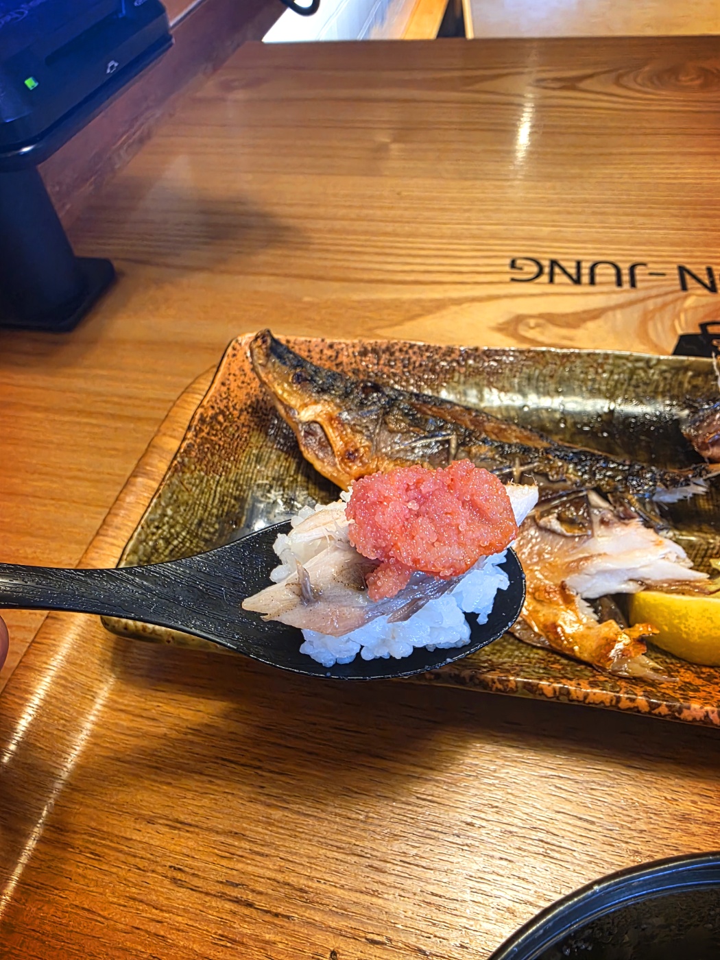 이번엔 밥과 고등어에 명란젓을 올려 한 입!😋