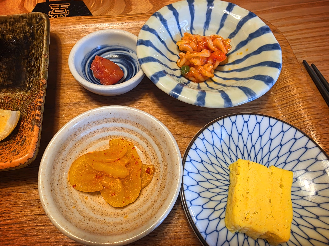 명란젓, 푸실리 파스타 샐러드, 단무지 무침, 계란말이 그리고 미소 된장국이에요😍
