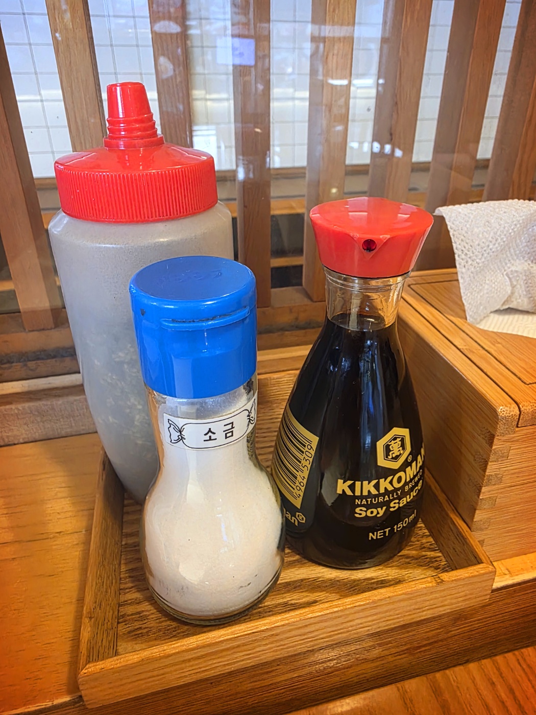 착석을 하면 보이는 수저와 갖은 양념들이에요.