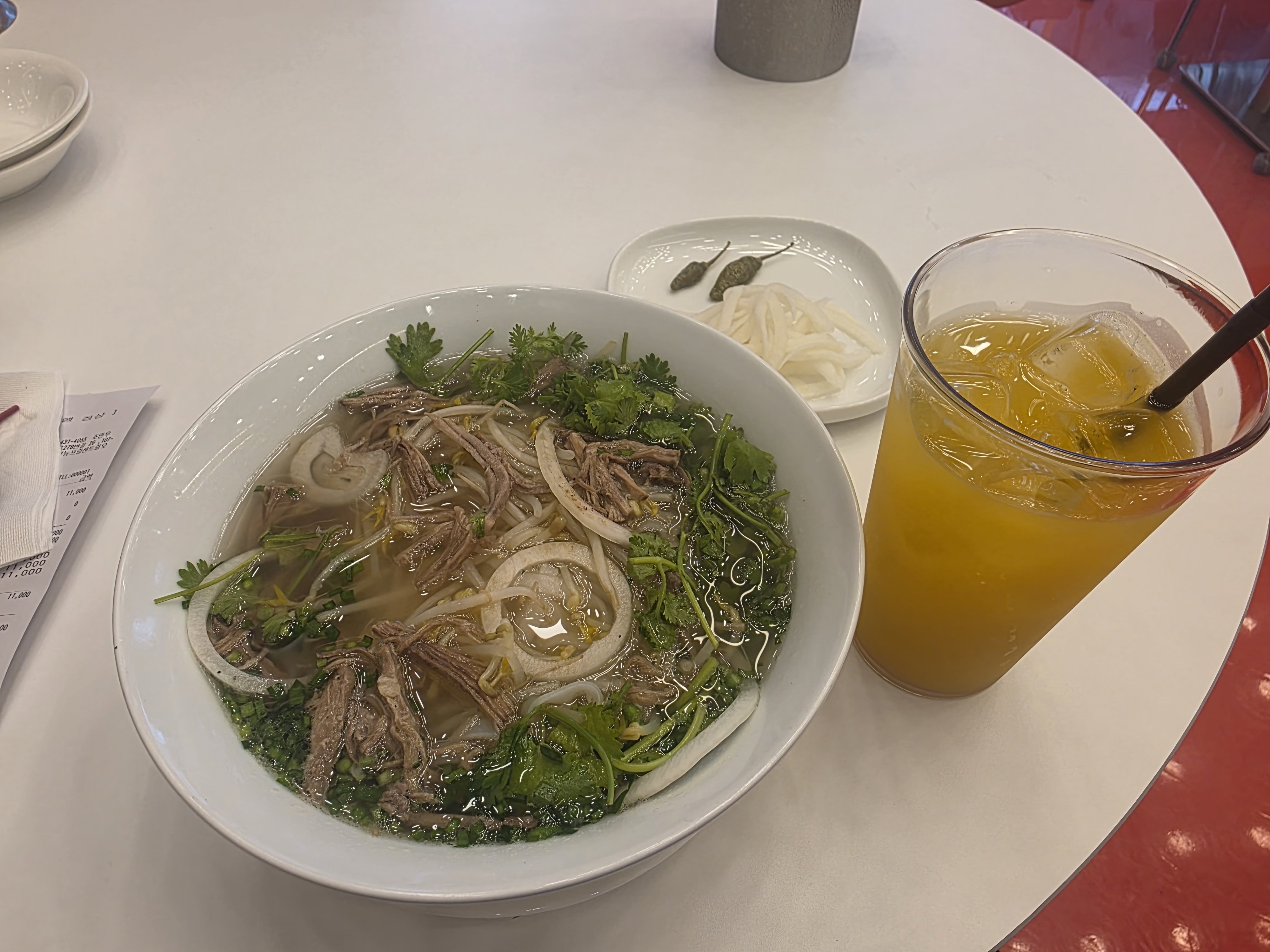 뜨거운 쌀국수와 달콤한 망고 주스가 잘 어울려요.